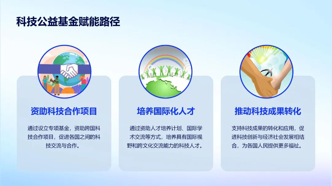 作(zuo)為全(quan)國(guo)(guo)優質的科技(ji)(ji)公(gong)益,王(wang)飛(fei)(fei)院長始(shi)終致(zhi)力于(yu)借助(zhu)(zhu)研究院背(bei)后(hou)強大的科技(ji)(ji)實(shi)力和人才(cai)(cai)力量賦(fu)能科技(ji)(ji)成果(guo)轉化(hua)(hua)。因此在本場發布(bu)會上,王(wang)飛(fei)(fei)院長也(ye)是發起成立(li)“一(yi)帶一(yi)路彩(cai)虹橋國(guo)(guo)際(ji)人才(cai)(cai)計劃”科技(ji)(ji)公(gong)益專項基金倡(chang)議,希望通過(guo)資助(zhu)(zhu)科技(ji)(ji)合(he)作(zuo)項目、培養國(guo)(guo)際(ji)化(hua)(hua)人才(cai)(cai)和推動(dong)科技(ji)(ji)成果(guo)轉化(hua)(hua)三條賦(fu)能路徑(jing)來(lai)促進國(guo)(guo)內國(guo)(guo)際(ji)科技(ji)(ji)交流與合(he)作(zuo),在”一帶一路”倡議的全球布局(ju)下,高速(su)推動科技創新、產業復(fu)興、企業出(chu)海的澎湃力(li)量。