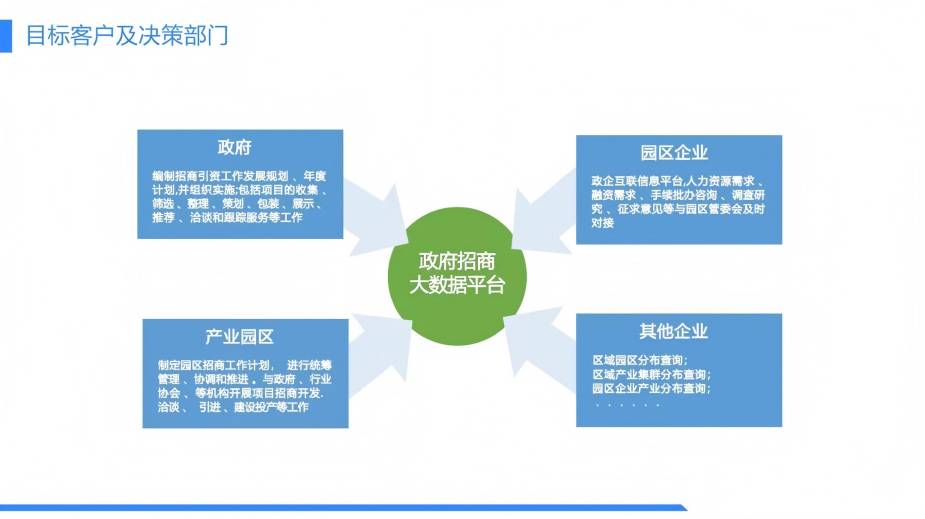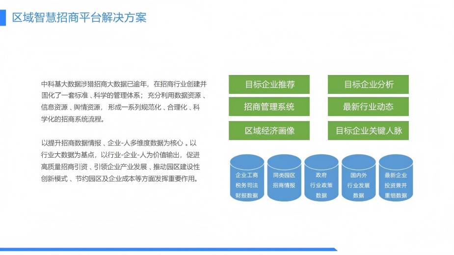 采(cai)用(yong)大數(shu)據(ju)(ju)加人工智能等技術手段(duan),對(dui)各個功能模塊形(xing)成(cheng)強大的(de)技術支撐,采(cai)用(yong)互聯網和權威的(de)工商人才經(jing)濟(ji)等第三(san)方機構的(de)數(shu)據(ju)(ju),形(xing)成(cheng)對(dui)平(ping)臺功能的(de)外部(bu)數(shu)據(ju)(ju)支持,精(jing)準匹配招(zhao)商線索,提高企(qi)業召(zhao)回率(企(qi)業召(zhao)回率超(chao)過(guo)90%,遠超(chao)傳統招(zhao)商的(de)40%),提升投資規劃效率。