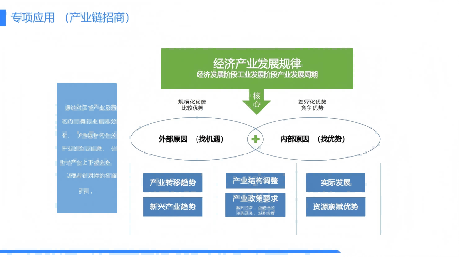 以(yi)行(xing)業(ye)數據庫(ku)(ku)、產(chan)業(ye)情報(bao)庫(ku)(ku)、企(qi)業(ye)數據庫(ku)(ku)多維數據為核(he)心,從產(chan)業(ye)、區域、企(qi)業(ye)等(deng)多角度為園(yuan)區全面繪制產(chan)業(ye)鏈畫像,精(jing)準定位(wei)園(yuan)區產(chan)業(ye)的優勢、劣勢、缺失產(chan)業(ye)環(huan)節,提供強(qiang)(qiang)鏈、補(bu)鏈、延(yan)伸等(deng)多種優化策略,基于薄弱或(huo)缺失環(huan)節實(shi)(shi)施強(qiang)(qiang)鏈、補(bu)鏈,依(yi)托(tuo)優勢產(chan)業(ye)環(huan)節實(shi)(shi)施上(shang)下游(you)延(yan)伸,最(zui)終加強(qiang)(qiang)園(yuan)區集聚效應。