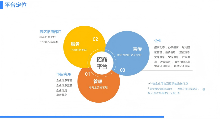 以天津(jin)市(shi)招商(shang)管(guan)理平臺(tai)為例,其(qi)主要服務對象是(shi)各級(ji)政府 (園區(qu)(qu)) 招商(shang)部 門(men) 。內含重(zhong)要企業 、項(xiang)目儲備(bei) 、招商(shang)活(huo)動(dong) 、項(xiang)目跟蹤 、落地項(xiang)目審(shen)核 (網(wang)上直報系統(tong)) 、投(tou)資(合作)動(dong)態分析、決策服務 、績效考核 、網(wang)上培訓等十幾個(ge)主題數(shu)據(ju)庫 。招商(shang)管(guan)理平臺(tai)著力打造各級(ji)政府工作部門(men)聯動(dong)的智能管(guan)理體 系, 對各區(qu)(qu) 、園區(qu)(qu)采取功能柔性配置(zhi)模(mo)式。